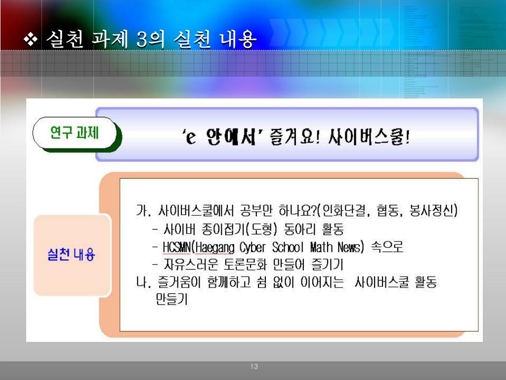 실천사례로 본 제언 • 연구주제 선정 시 고려할 사항 • 사이버스쿨을 활용한 수업이 최적의 교육효과를 낼 수 있는 주제 선정 - 해당 주제 해결을 위해 꼭 필요한 교육매체가 사이버스쿨이어야 한다 - 전 기능의 활용과 교사가 임의로 만들 수 있는 게시판 등을 활용한 학생관리 • 연구 주제 선정에 있어서 독창성과 아이디어 개발 - 기존의 연구 주제와는 차별성이 보이고 특별한 학습 아이디어의 개발과 활용 - 독창성이 확보된 자료를 준비 - 기 활용된 주제일지라도 독창적인 실천 방법 등을 전개한다면 적극 반영 • 연구 주제의 일반화가능성이 높아야 - 연구 주제 및 실천과정, 결과물 등이 타 연구자에 의해서도 실천 가능한지의 여부 - 주제 선정 이유, 사이버스쿨 활용 계획 및 방법, 학습동기유발 및 강화, 학습자료의 독창성및 일반화 가능성 등 효율적인 것