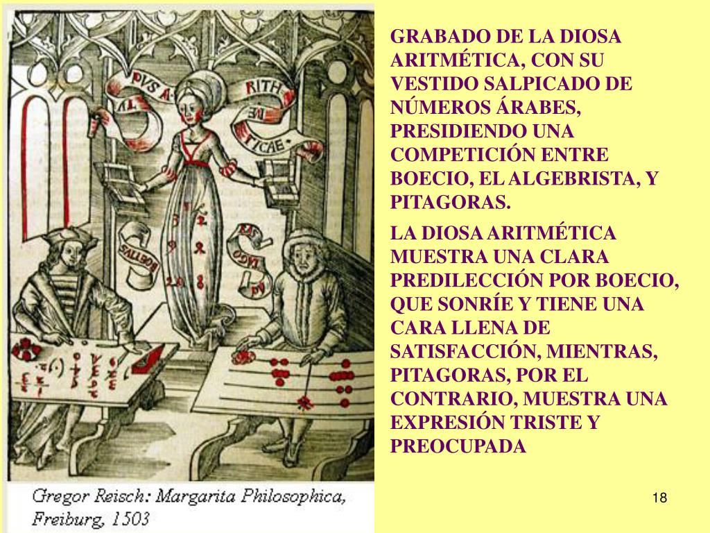 GRABADO DE LA DIOSA ARITMÉTICA, CON SU VESTIDO SALPICADO DE NÚMEROS ÁRABES, PRESIDIENDO UNA COMPETICIÓN ENTRE BOECIO, EL ALGEBRISTA, Y PITAGORAS. LA DIOSA ARITMÉTICA MUESTRA UNA CLARA PREDILECCIÓN POR BOECIO, QUE SONRÍE Y TIENE UNA CARA LLENA DE SATISFACCIÓN, MIENTRAS, PITAGORAS, POR EL CONTRARIO, MUESTRA UNA EXPRESIÓN TRISTE Y PREOCUPADA