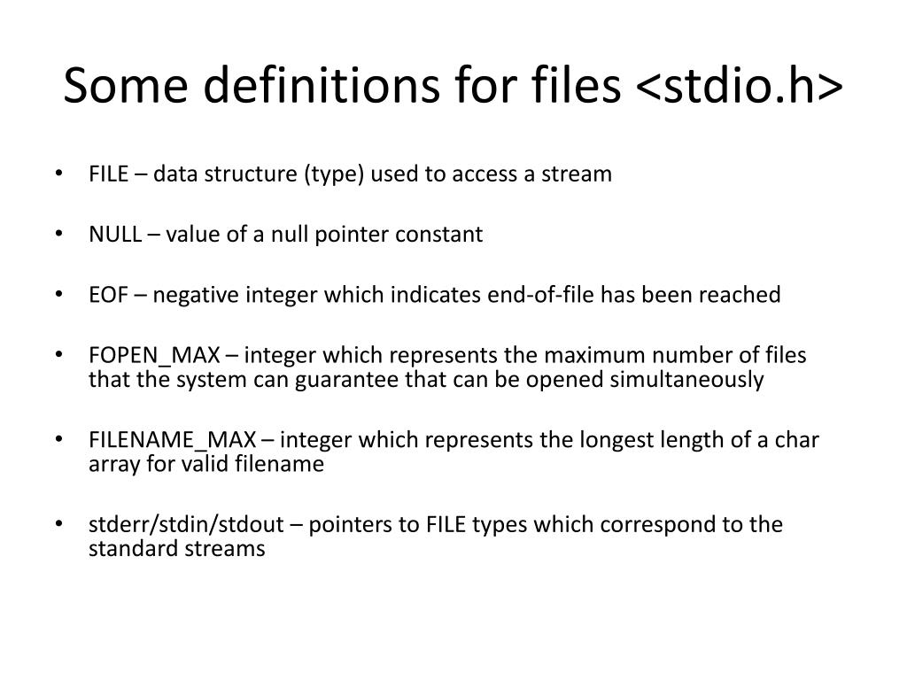 Some definitions for files <stdio.h> • FILE – data structure (type) used to access a stream • NULL – value of a null pointer constant • EOF – negative integer which indicates end-of-file has been reached • FOPEN_MAX – integer which represents the maximum number of files that the system can guarantee that can be opened simultaneously • FILENAME_MAX – integer which represents the longest length of a char array for valid filename • stderr/stdin/stdout– pointers to FILE types which correspond to the standard streams