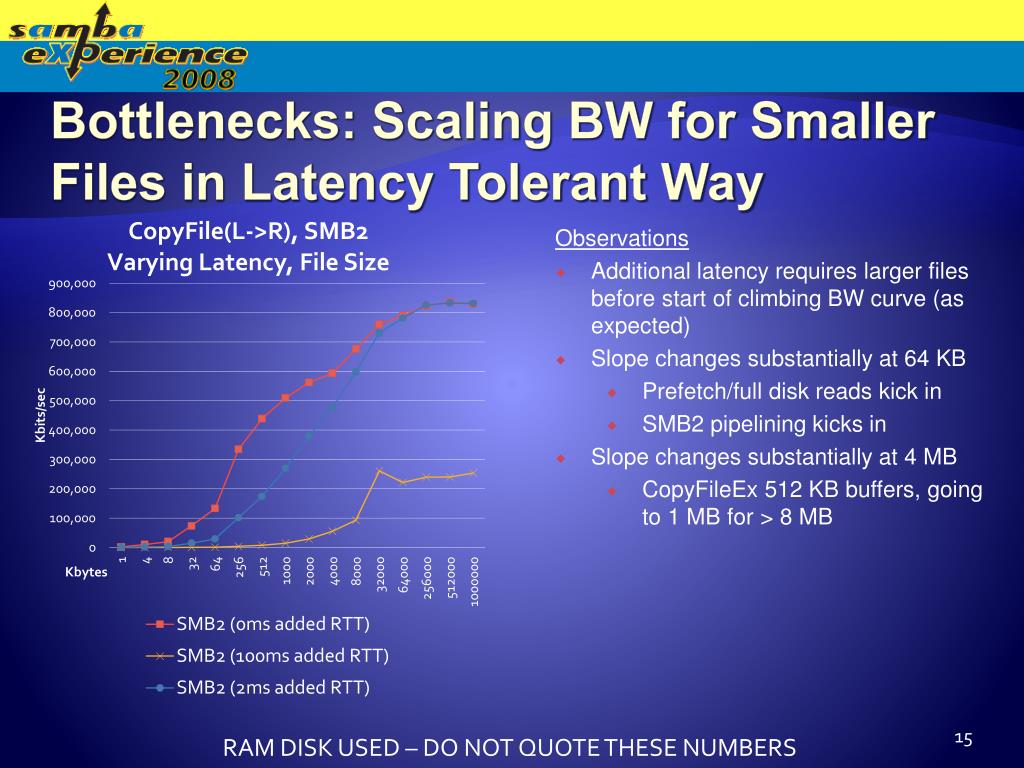 Bottlenecks: Scaling BW for Smaller Files in Latency Tolerant Way • Observations • Additional latency requires larger files before start of climbing BW curve (as expected) • Slope changes substantially at 64 KB • Prefetch/full disk reads kick in • SMB2 pipelining kicks in • Slope changes substantially at 4 MB • CopyFileEx 512 KB buffers, going to 1 MB for > 8 MB RAM DISK USED – DO NOT QUOTE THESE NUMBERS