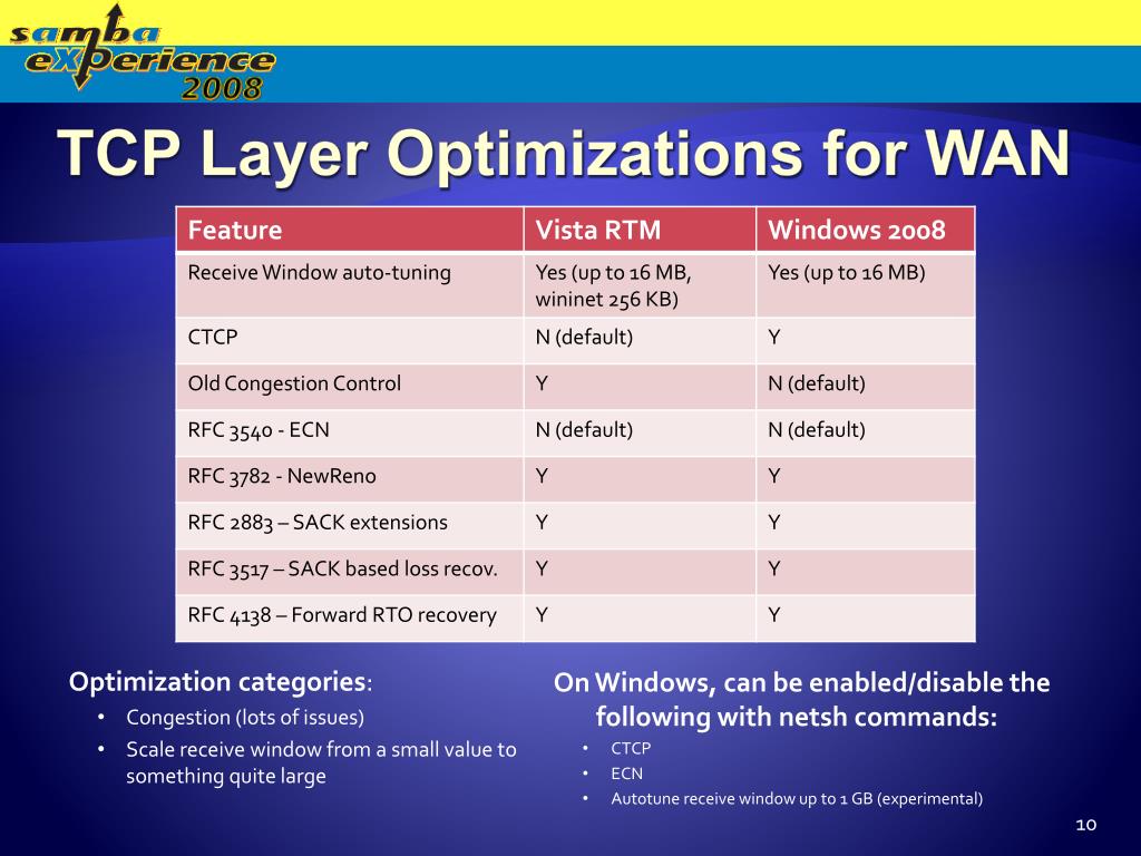 TCP Layer Optimizations for WAN • Optimization categories: • Congestion (lots of issues) • Scale receive window from a small value to something quite large • On Windows, can be enabled/disable the following with netsh commands: • CTCP • ECN • Autotune receive window up to 1 GB (experimental) 10