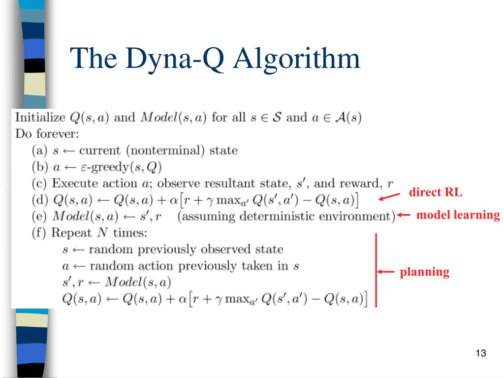 Learning, Planning, and Acting • Two uses of real experience: • model learning: to improve the model • direct RL: to directly improve the value function and policy • Improving value function and/or policy via a model is sometimes called indirect RL or model-based RL. Here,we call it planning.