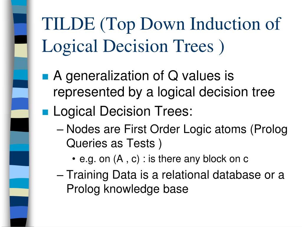 TILDE (Top Down Induction of LogicalDecision Trees ) • A generalization of Q values is represented by a logical decision tree • Logical Decision Trees: • Nodes are First Order Logic atoms (Prolog Queries as Tests ) • e.g. on (A , c) : is there any block on c • Training Data is a relational database or a Prolog knowledge base