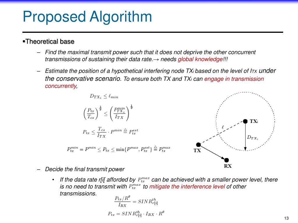 Proposed Algorithm • Theoretical base • Find the maximal transmit power such that it does not deprive the other concurrent transmissions of sustaining their data rate.→ needs global knowledge!!! • Estimate the position of a hypothetical interfering node TXi based on the level of ITX under the conservative scenario. To ensure both TX and TXi can engage in transmission concurrently, • Decide the final transmit power • If the data rate r[i[ afforded by can be achieved with a smaller power level, there is no need to transmit with to mitigate the interference level of other transmissions.