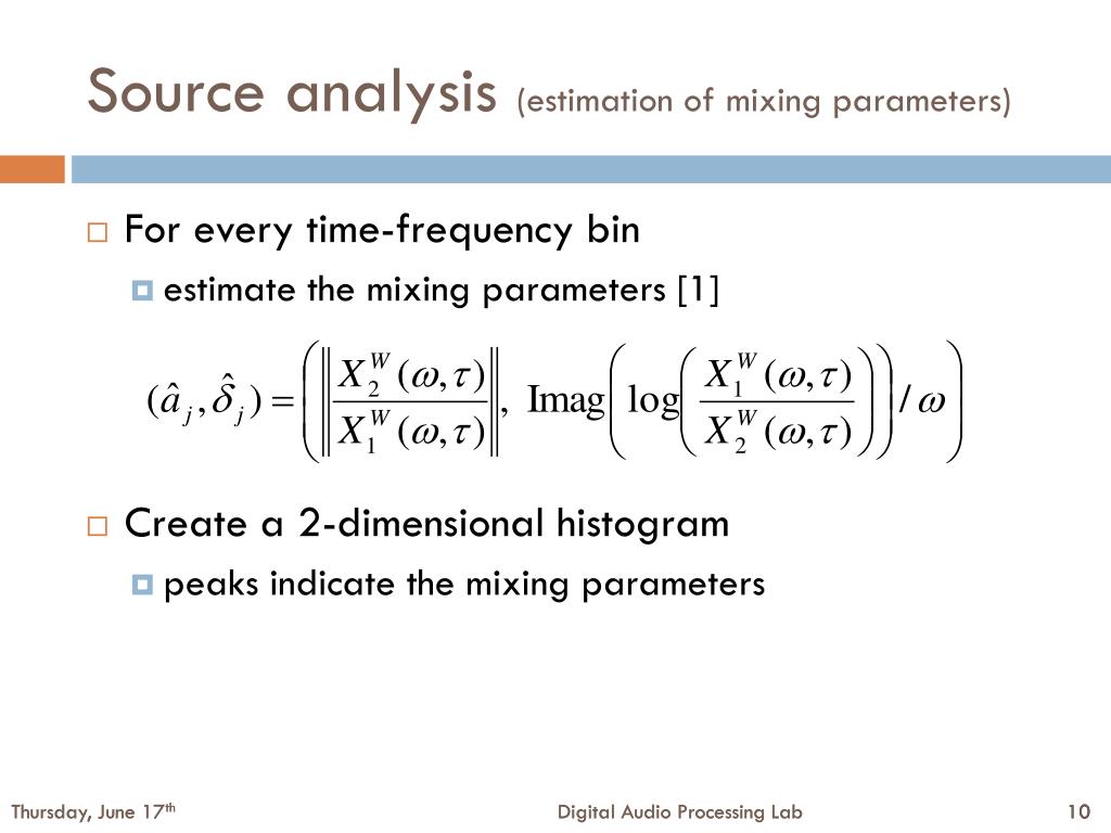 Source analysis (estimation of mixing parameters) • For every time-frequency bin • estimate the mixing parameters [1] • Create a 2-dimensional histogram • peaks indicate the mixing parameters