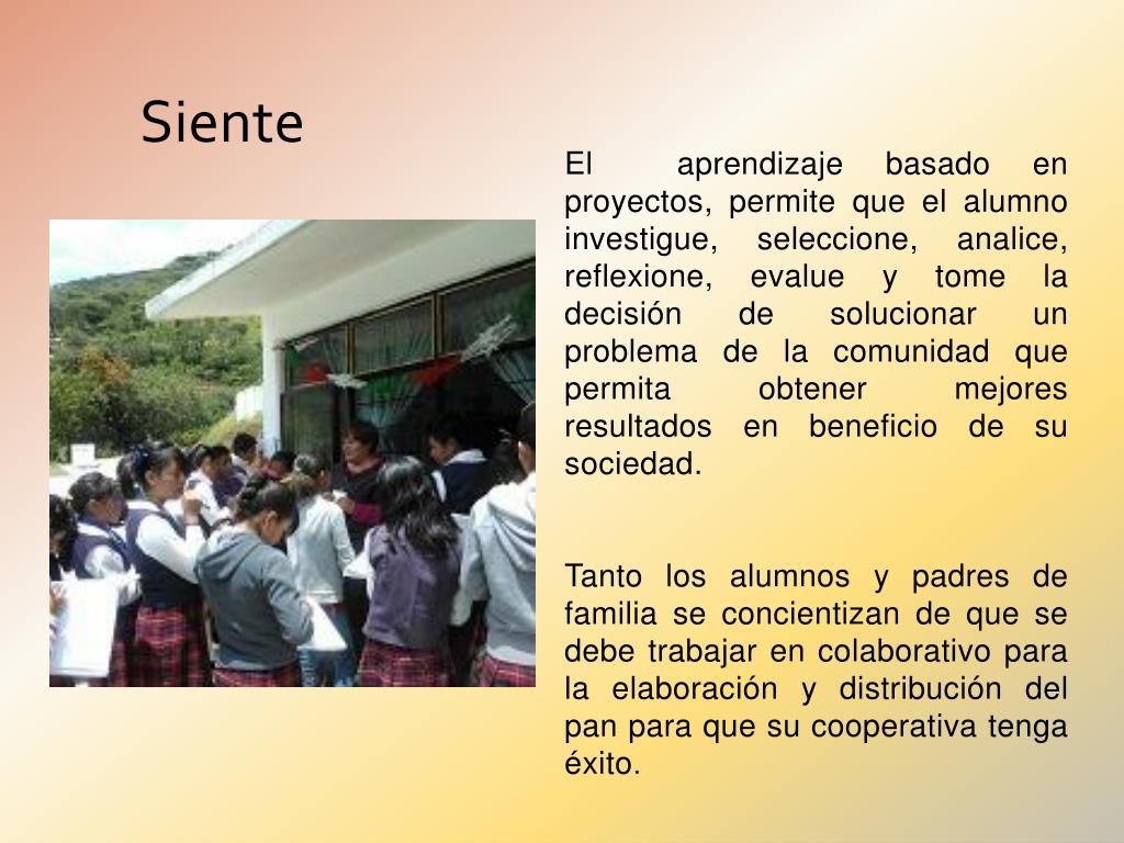 El aprendizajebasado en proyectos, permiteque el alumnoinvestigue, seleccione, analice, reflexione, evalue y tome la decisión de solucionar un problema de la comunidadquepermitaobtenermejoresresultadosen beneficio de susociedad. Tanto los alumnos y padres de familia se concientizan de que se debetrabajar en colaborativoparala elaboración y distribución del pan paraquesucooperativatengaéxito. Siente