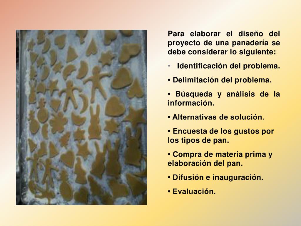 Para elaborar el diseño del proyecto de una panadería se debe considerar lo siguiente: • Identificación del problema. • • Delimitación del problema. • • Búsqueda y análisis de la información. • • Alternativas de solución. • • Encuesta de los gustos por los tipos de pan. • • Compra de materia prima y elaboración del pan. • • Difusión e inauguración. • • Evaluación.