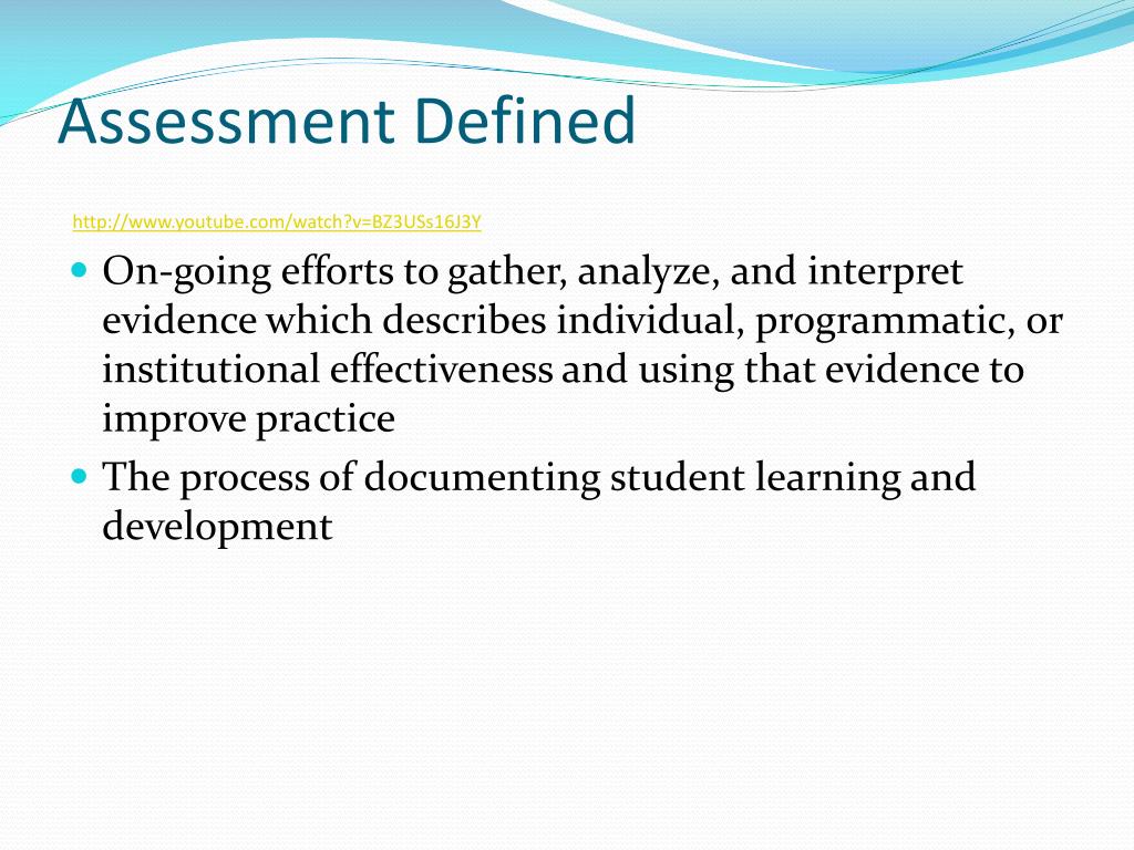 Assessment Definedhttp://www.youtube.com/watch?v=BZ3USs16J3Y • On-going efforts to gather, analyze, and interpret evidence which describes individual, programmatic, or institutional effectiveness and using that evidence to improve practice • The process of documenting student learning and development