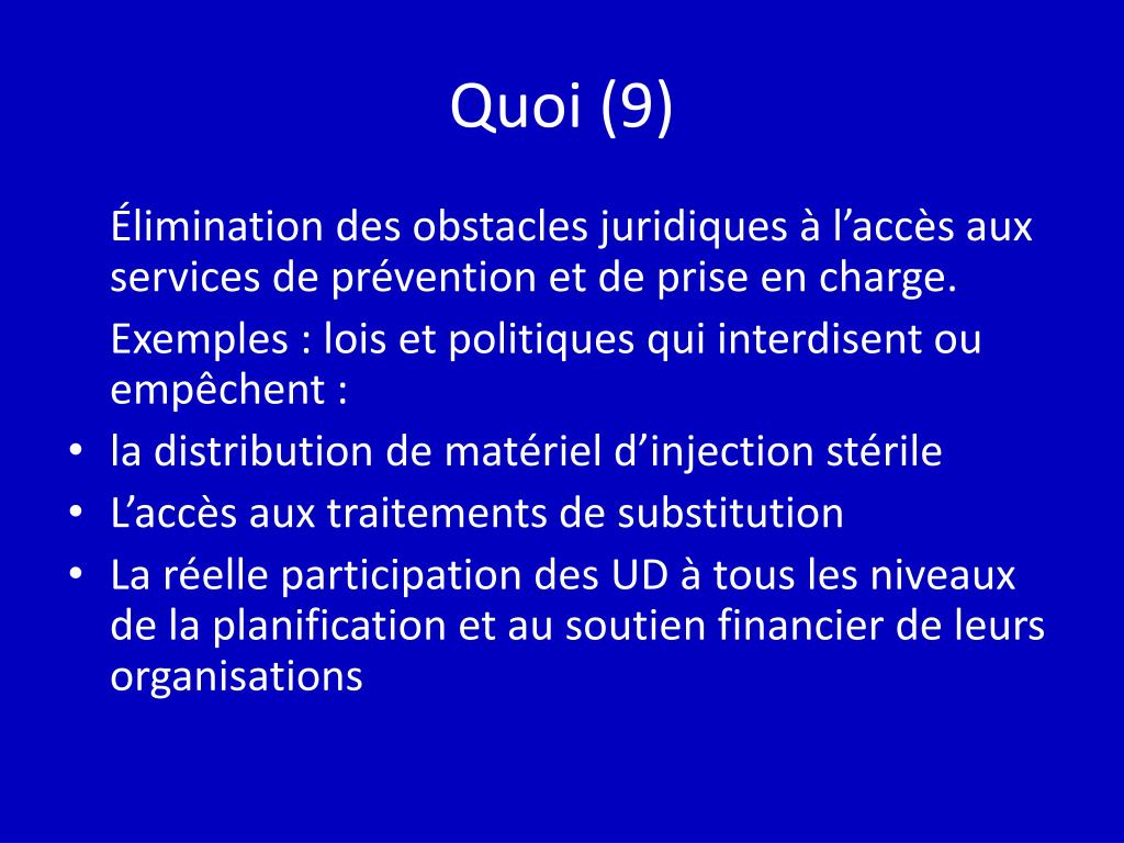 Quoi (9) Élimination des obstacles juridiques à l’accès aux services de prévention et de prise en charge. Exemples : lois et politiques qui interdisent ou empêchent : • la distribution de matériel d’injection stérile • L’accès aux traitements de substitution • La réelle participation des UD à tous les niveaux de la planification et au soutien financier de leurs organisations