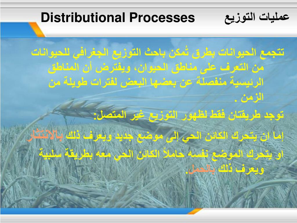 عمليات التوزيع Distributional Processes تتجمع الحيوانات بطرق تُمكن باحث التوزيع الجغرافي للحيوانات من التعرف على مناطق الحيوان، ويفترض أن المناطق الرئيسية منفصلة عن بعضها البعض لفترات طويلة من الزمن . توجد طريقتان فقط لظهور التوزيع غير المتصل: إما ان يتحرك الكائن الحي إلى موضع جديد ويعرف ذلك بالانتثار او يتحرك الموضع نفسه حاملاً الكائن الحي معه بطريقة سلبية ويعرف ذلك بالحمل.