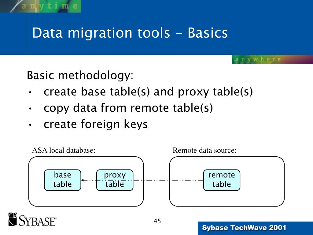 Basic methodology: create base table(s) and proxy table(s) copy data from remote table(s) create foreign keys ASA local database: Remote data source: base table proxy table remote table Data migration tools - Basics