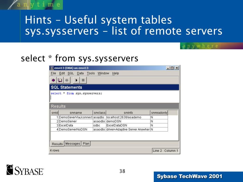 select table_name, remote_location, existing_obj from systable where remote_location is not NULL; Hints – Useful system tablessys.systable – list of proxy tables