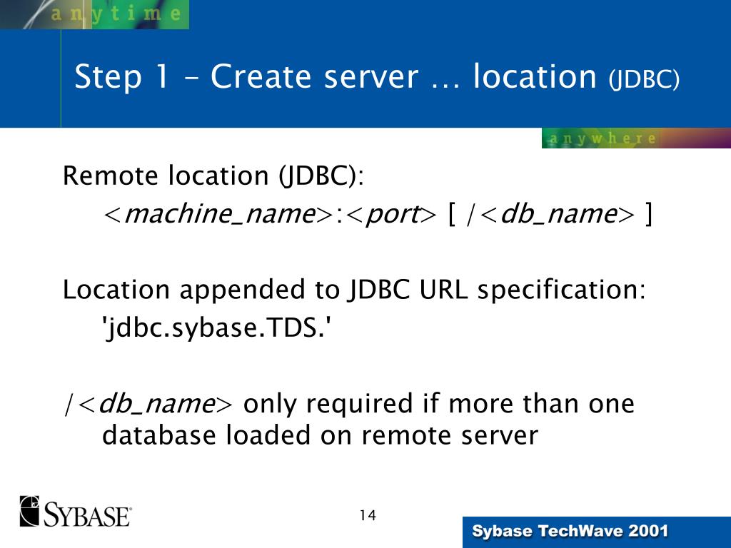 Remote location (JDBC): <machine_name>:<port> [ /<db_name> ] Location appended to JDBC URL specification: 'jdbc.sybase.TDS.' /<db_name> only required if more than one database loaded on remote server Step 1 – Create server … location (JDBC)
