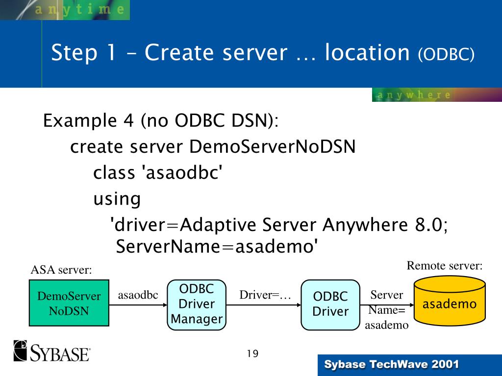 Remote location (ODBC): <DSN_name> [ ; <other_options> ] DSN (data source name) normally specifies parameters on how to find remote server Driver name Driver specific parameters: E.g. ServerName Connection is in context of the ASA server Step 1 – Create server … location (ODBC)