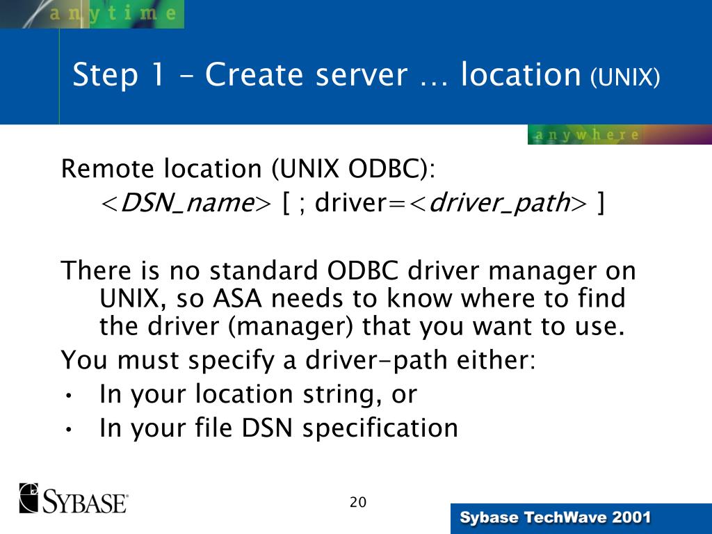 Remote location (UNIX ODBC): <DSN_name> [ ; driver=<driver_path> ] There is no standard ODBC driver manager on UNIX, so ASA needs to know where to find the driver (manager) that you want to use. You must specify a driver-path either: In your location string, or In your file DSN specification Step 1 – Create server … location (UNIX)