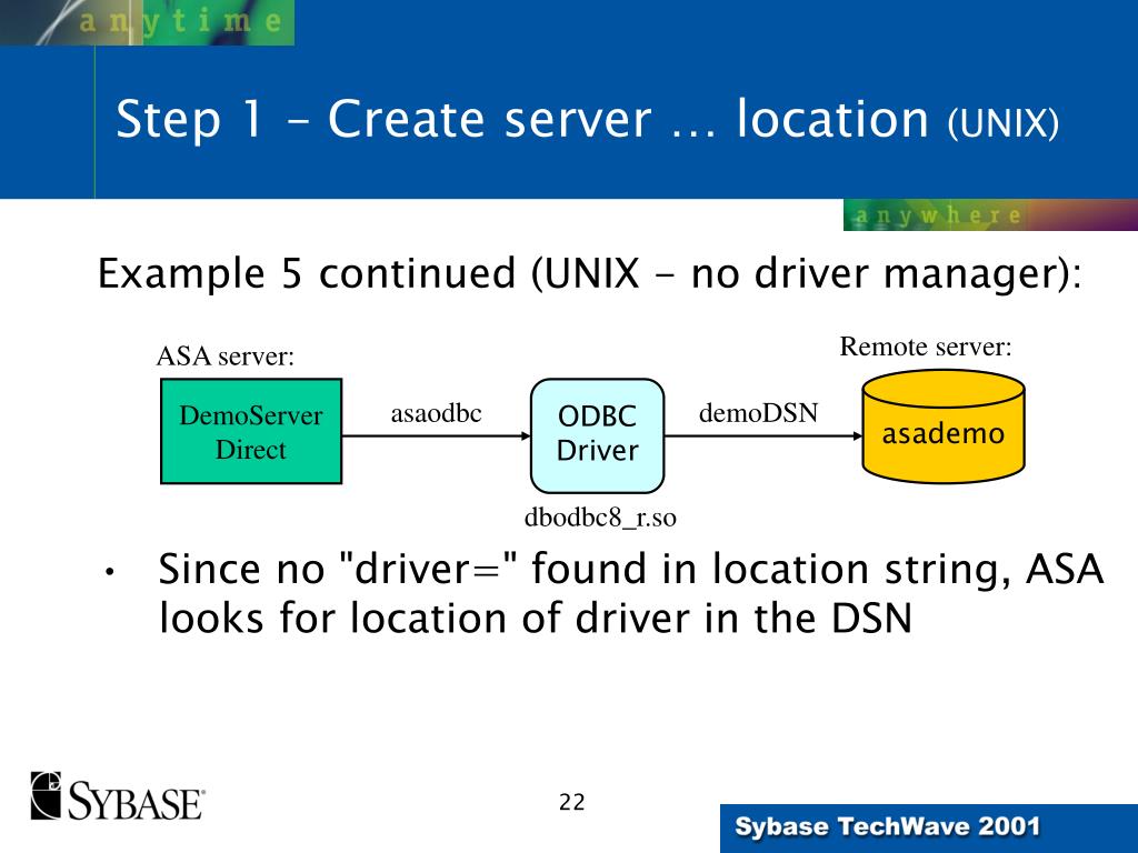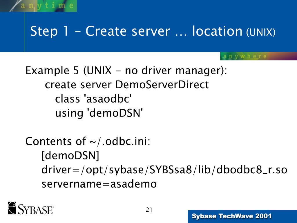 Example 5 (UNIX - no driver manager): create server DemoServerDirect class 'asaodbc' using 'demoDSN' Contents of ~/.odbc.ini: [demoDSN] driver=/opt/sybase/SYBSsa8/lib/dbodbc8_r.so servername=asademo Step 1 – Create server … location (UNIX)