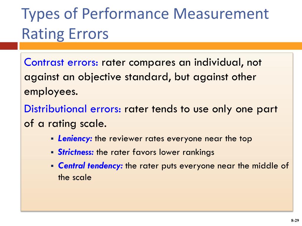 Types of Performance MeasurementRating Errors Contrast errors: rater compares an individual, not against an objective standard, but against other employees. Distributional errors: rater tends to use only one part of a rating scale. • Leniency: the reviewer rates everyone near the top • Strictness:the rater favors lower rankings • Central tendency: the rater puts everyone near the middle of the scale