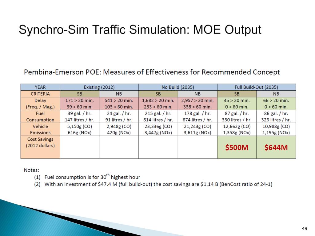 Key Study Methodologies (Methodology Integration) Vehicle Demand Forecasts • Hourly arrivals by vehicle category (autos, trucks) • Hourly data: Synchro-Sim Traffic and undertake LOS analysis Synchro-Sim Traffic Simulation Model • 30th highest hour: establish design parameters (ex: # PIL booths) • Establish trigger points for phasing in improvements Level of Service (LOS) Framework • Sensitivity analysis to verify and refine phasing of improvements • Capability to assess various processing / infrastructure scenarios • Verification of Synchro-Sim queue lengths