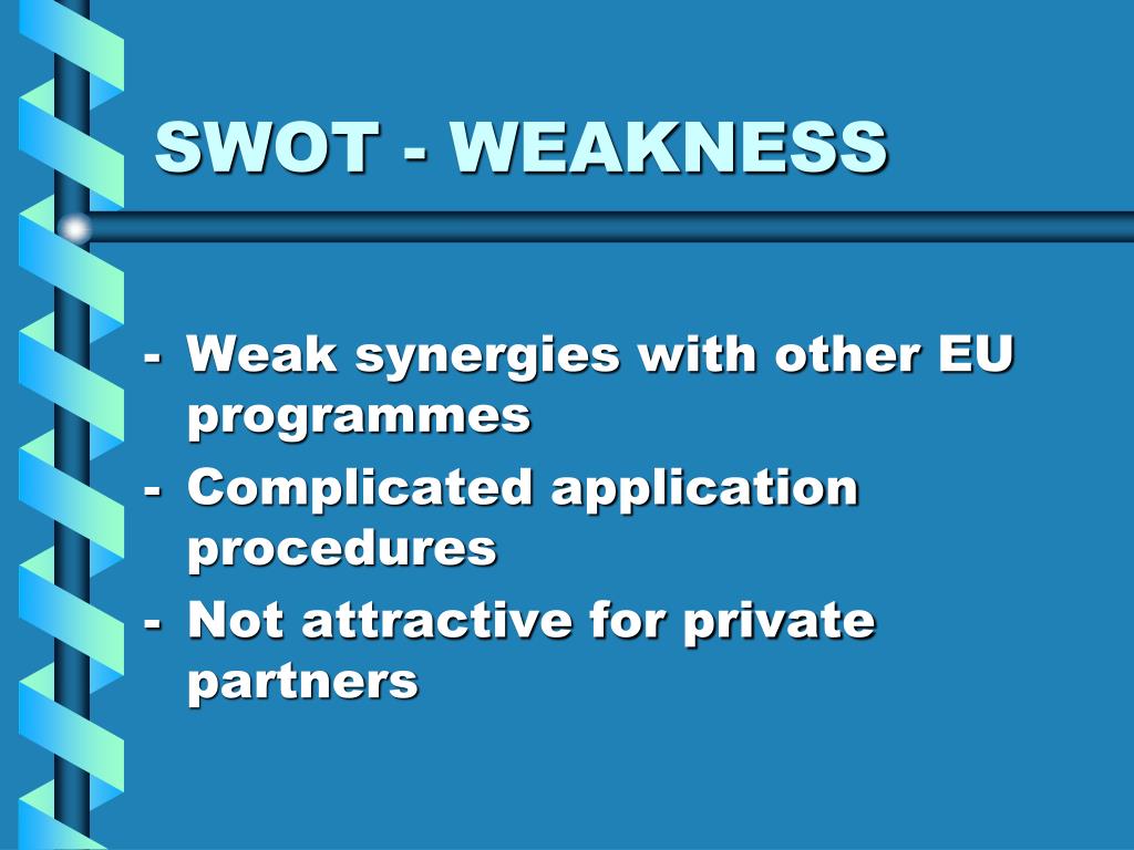SWOT - WEAKNESS • Weak synergies with other EU programmes • Complicated application procedures • Not attractive for private partners
