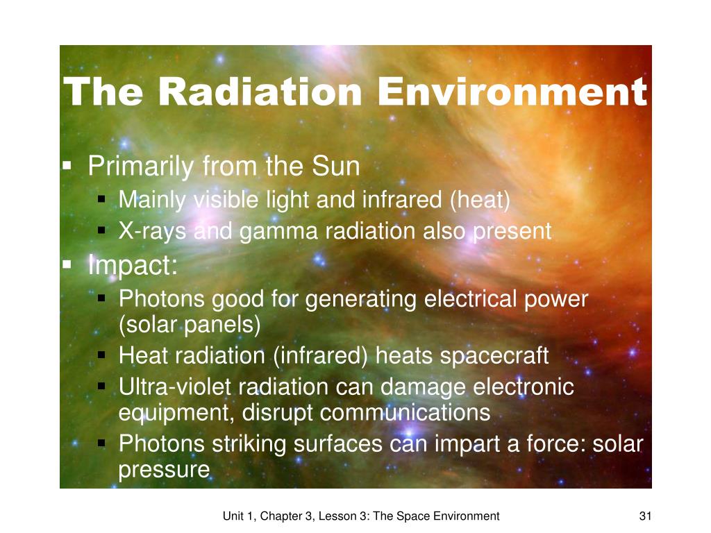 The Radiation Environment • Primarily from the Sun • Mainly visible light and infrared (heat) • X-rays and gamma radiation also present • Impact: • Photons good for generating electrical power (solar panels) • Heat radiation (infrared) heats spacecraft • Ultra-violet radiation can damage electronic equipment, disrupt communications • Photons striking surfaces can impart a force: solar pressure Unit 1, Chapter 3, Lesson 3: The Space Environment