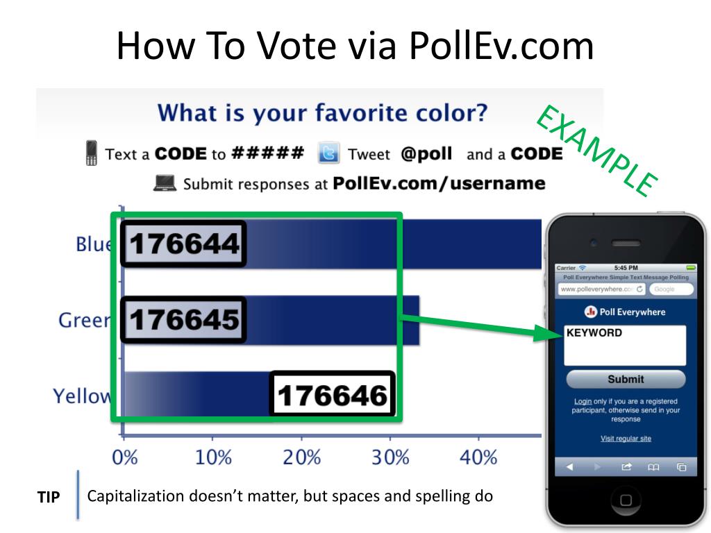 How To Vote via PollEv.com EXAMPLE Capitalization doesn’t matter, but spaces and spelling do TIP