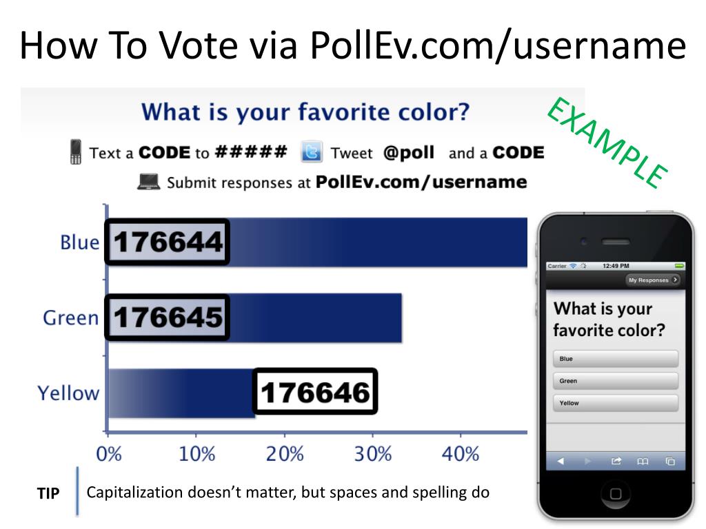 How To Vote via PollEv.com/username EXAMPLE Capitalization doesn’t matter, but spaces and spelling do TIP