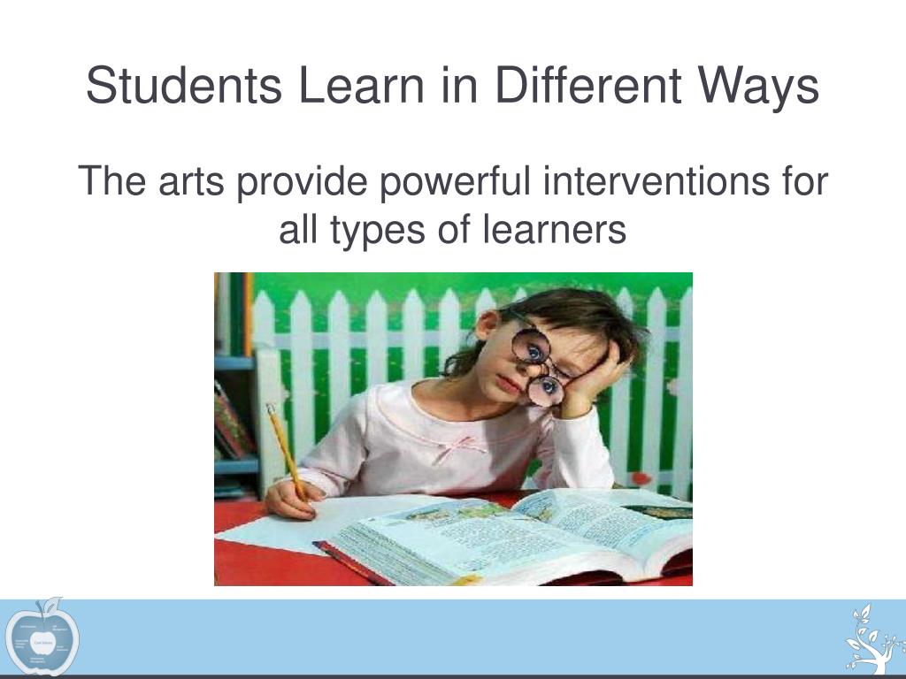 Students Learn in Different Ways The arts provide powerful interventions for all types of learners