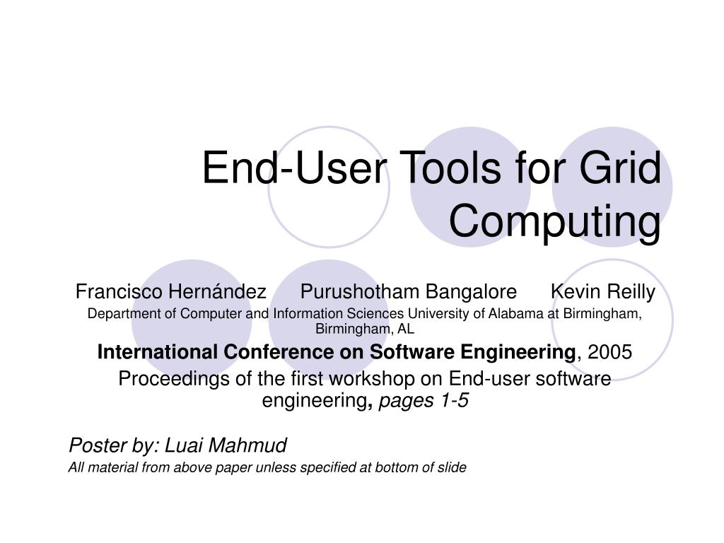 End-User Tools for Grid Computing Francisco Hernández Purushotham Bangalore Kevin Reilly Department of Computer and Information Sciences University of Alabama at Birmingham, Birmingham, AL International Conference on Software Engineering, 2005 Proceedings of the first workshop on End-user software engineering, pages 1-5 Poster by: Luai Mahmud All material from above paper unless specified at bottom of slide