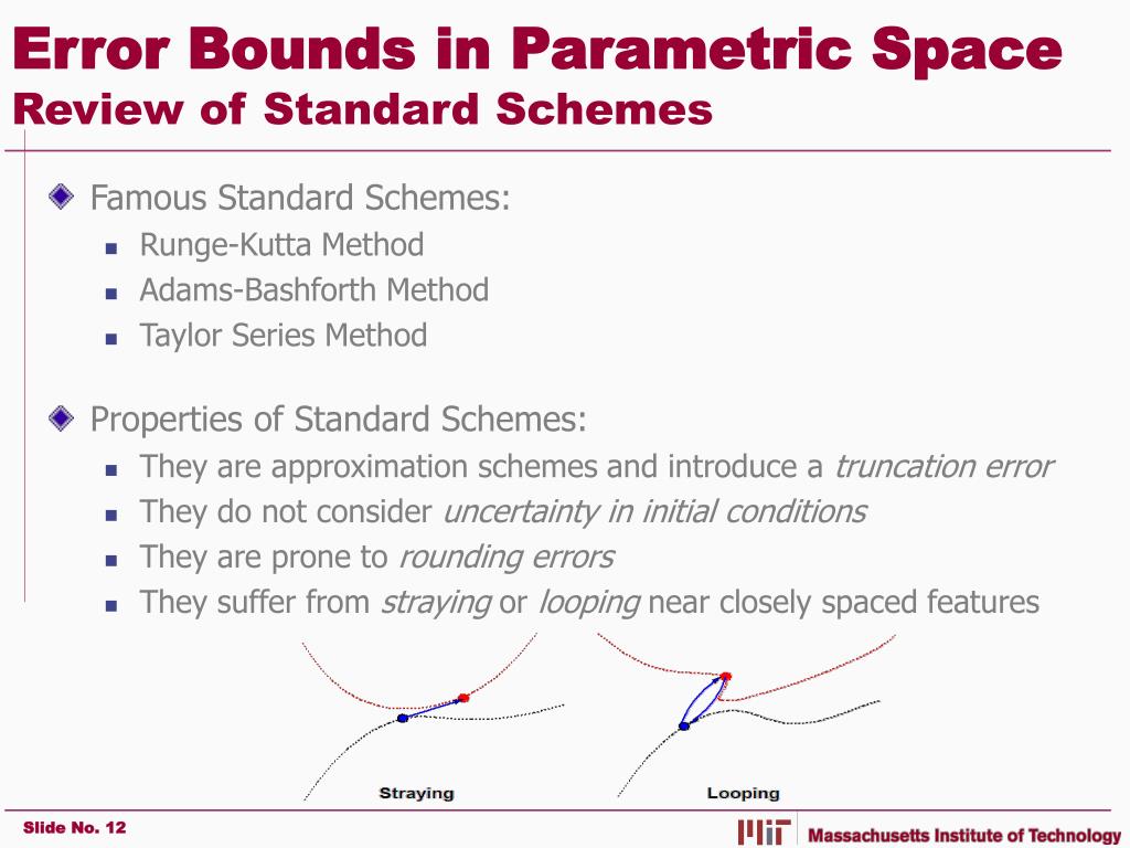 Error Bounds in Parametric SpaceReview of Standard Schemes • Famous Standard Schemes: • Runge-Kutta Method • Adams-Bashforth Method • Taylor Series Method • Properties of Standard Schemes: • They are approximation schemes and introduce a truncation error • They do not consider uncertainty in initial conditions • They are prone to rounding errors • They suffer from straying or looping near closely spaced features Slide No. 12