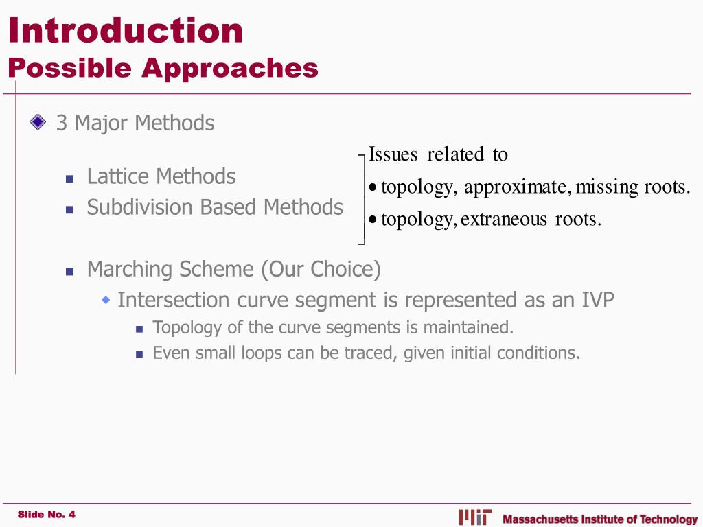 IntroductionPossible Approaches • 3 Major Methods • Lattice Methods • Subdivision Based Methods • Marching Scheme (Our Choice) • Intersection curve segment is represented as an IVP • Topology of the curve segments is maintained. • Even small loops can be traced, given initial conditions. Slide No. 4