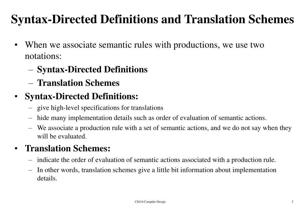 Syntax-Directed Definitions and Translation Schemes • When we associate semantic rules with productions, we use two notations: • Syntax-Directed Definitions • Translation Schemes • Syntax-Directed Definitions: • give high-level specifications for translations • hide many implementation details such as order of evaluation of semantic actions. • We associate a production rule with a set of semantic actions, and we do not say when they will be evaluated. • Translation Schemes: • indicate the order of evaluation of semantic actions associated with a production rule. • In other words, translation schemes give a little bit information about implementation details. CS416 Compiler Design
