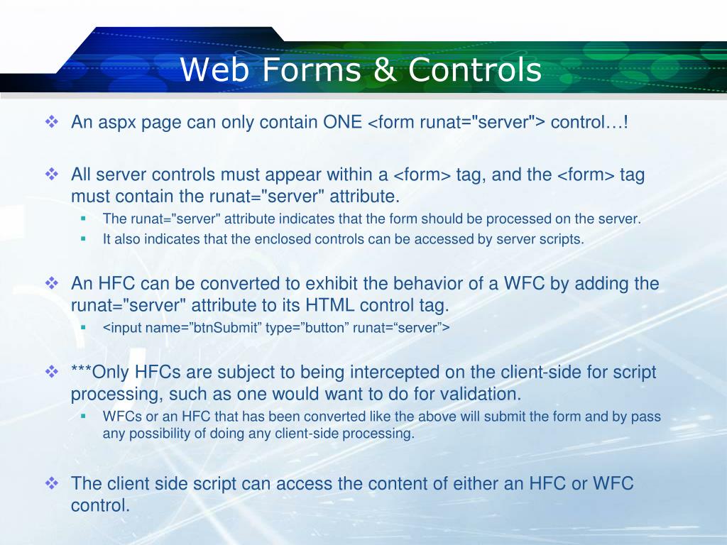 Web Forms & Controls • An aspx page can only contain ONE <form runat="server"> control…! • All server controls must appear within a <form> tag, and the <form> tag must contain the runat="server" attribute. • The runat="server" attribute indicates that the form should be processed on the server. • It also indicates that the enclosed controls can be accessed by server scripts. • An HFC can be converted to exhibit the behavior of a WFC by adding the runat="server" attribute to its HTML control tag. • <input name=”btnSubmit” type=”button” runat=“server”> • ***Only HFCs are subject to being intercepted on the client-side for script processing, such as one would want to do for validation. • WFCs or an HFC that has been converted like the above will submit the form and by pass any possibility of doing any client-side processing. • The client side script can access the content of either an HFC or WFC control.