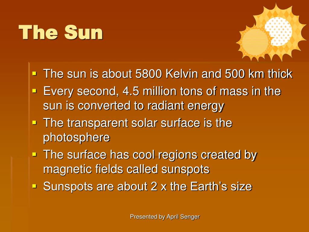The Sun • The sun is about 5800 Kelvin and 500 km thick • Every second, 4.5 million tons of mass in the sun is converted to radiant energy • The transparent solar surface is the photosphere • The surface has cool regions created by magnetic fields called sunspots • Sunspots are about 2 x the Earth’s size Presented by April Senger
