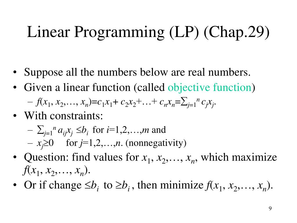Linear Programming (LP) (Chap.29) Suppose all the numbers below are real numbers. Given a linear function (called objective function ) f ( x 1 , x 2 ,…, x n )= c 1 x 1 + c 2 x 2 +…+ c n x n = j =1 n c j x j . With constraints: j =1 n a ij x j b i for i =1,2,…, m and