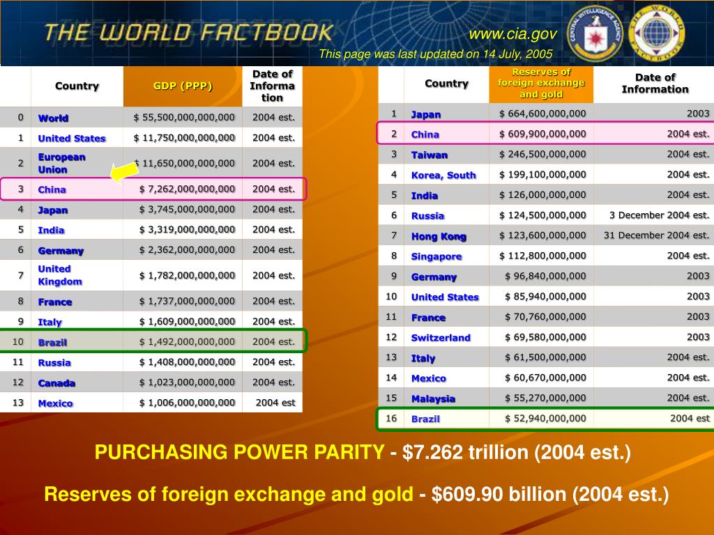 www.cia.gov This page was last updated on 14 July, 2005 PURCHASING POWER PARITY - $7.262 trillion (2004 est.) Reserves of foreign exchange and gold- $609.90 billion (2004 est.)