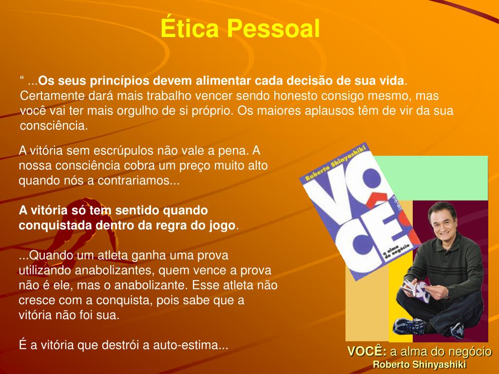 Ética Pessoal “ Vencer é ótimo, mas o mais importante é ter a consciência de que tudo foi feito dentro da ética... ” ...As melhores vitória são as conquistadas com muito treinamento, estratégia e dedicação. Respeite a si próprio e mantenha a dignidade. VOCÊ: a alma do negócioRoberto Shinyashiki Talvez a curto prazo isso possa representar uma derrota, mas a certeza de que você pode contar consigo próprio vai criar os fundamentos da conquista de muitas vitórias lá na frente. E, como você bem sabe, chegar ao pódio é difícil, mas muito mais complicado é permanecer. “