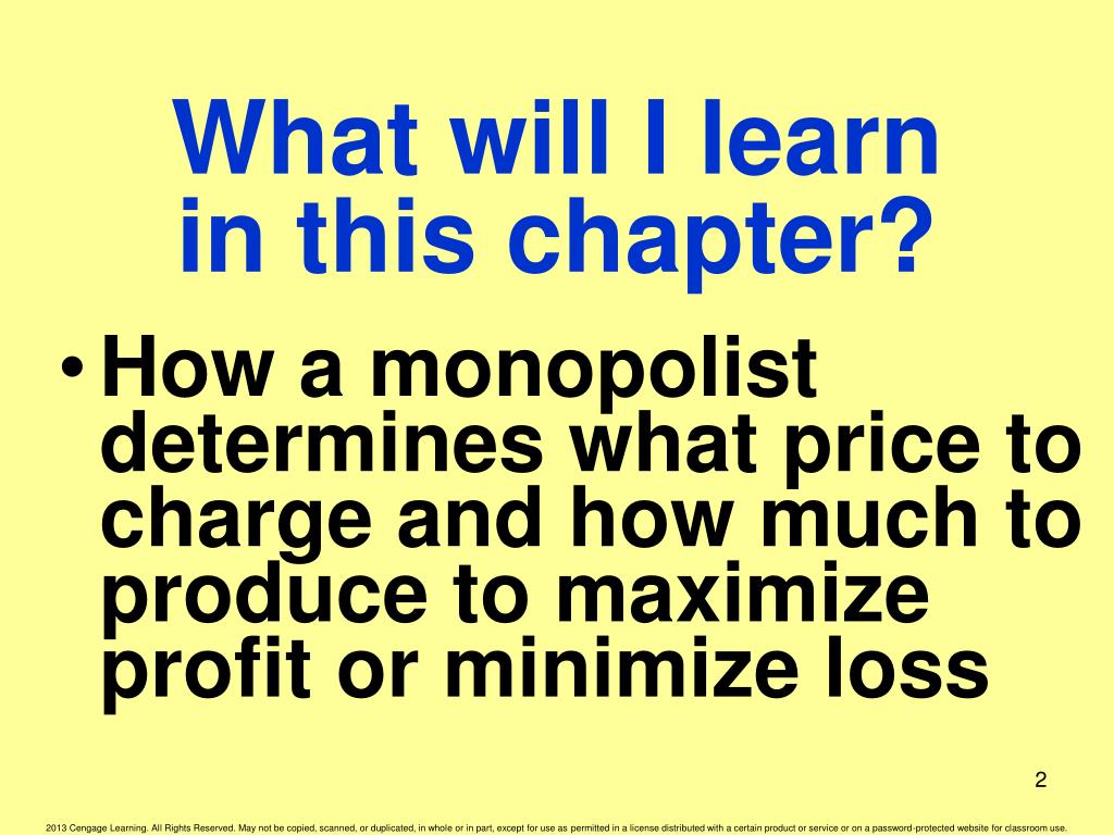 What will I learn in this chapter? • How a monopolist determines what price to charge and how much to produce to maximize profit or minimize loss