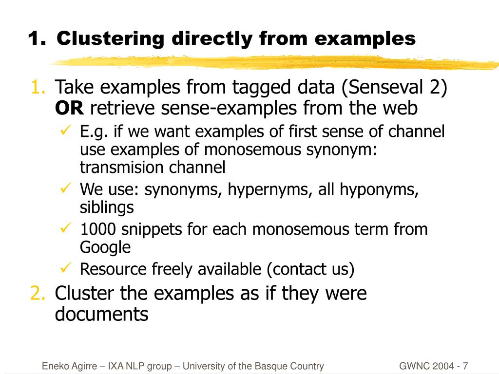 1. Clustering directly from examples:Retrieving sense-examples from the web • Examples of word senses scarce • Alternative, automatically acquire examples from corpora (or web) • In this paper we follow the monosemous relative method (Leacock et al.1998) • E.g. if we want examples of first sense of channel use examples of monosemous synonym: transmision channel • We use: synonyms, hypernyms, all hyponyms, siblings • 1000 snippets for each monosemous term from Google • Heuristics to extract partial or full meaningful sentences • More details of the method in (Agirre et al. 2001)