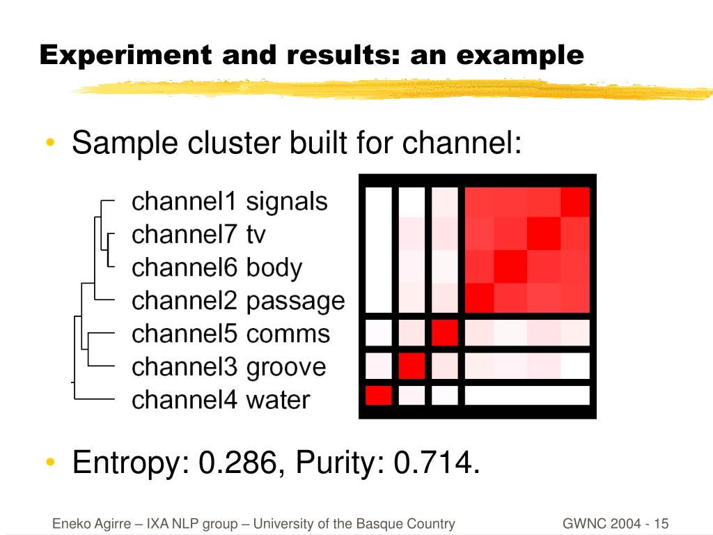 Experiment and results: an example • Sample cluster built for channel: • Entropy: 0.286, Purity: 0.714.