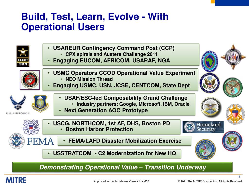 Build, Test, Learn, Evolve - With Operational Users • USAREUR Contingency Command Post (CCP) • CPX spirals and Austere Challenge 2011 • Engaging EUCOM, AFRICOM, USARAF, NGA • USMC Operators CCOD Operational Value Experiment • NEO Mission Thread • Engaging USMC, USN, JCSE, CENTCOM, State Dept • USAF/ESC-led Composability Grand Challenge • Industry partners: Google, Microsoft, IBM, Oracle • Next Generation AOC Prototype • USCG, NORTHCOM, 1st AF, DHS, Boston PD • Boston Harbor Protection • FEMA/LAFD Disaster Mobilization Exercise • USSTRATCOM - C2 Modernization for New HQ Demonstrating Operational Value – Transition Underway