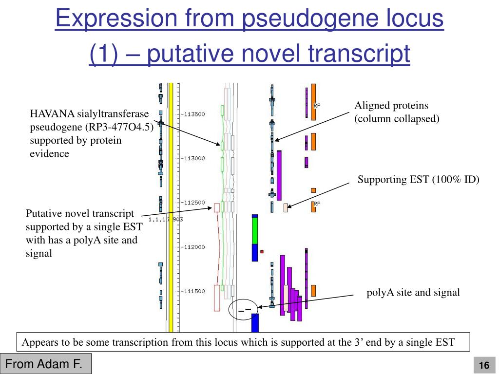 Expression from pseudogene locus (1) – putative novel transcript Aligned proteins (column collapsed) HAVANA sialyltransferase pseudogene (RP3-477O4.5) supported by protein evidence Supporting EST (100% ID) Putative novel transcript supported by a single EST with has a polyA site and signal polyA site and signal Appears to be some transcription from this locus which is supported at the 3’ end by a single EST From Adam F.