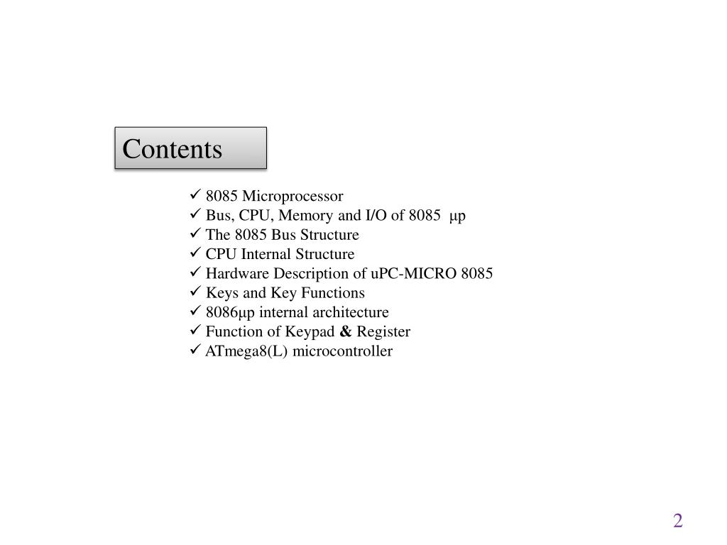 Contents • 8085 Microprocessor • Bus, CPU, Memory and I/O of 8085 μp • The 8085 Bus Structure • CPU Internal Structure • Hardware Description of uPC-MICRO 8085 • Keys and Key Functions • 8086μp internal architecture • Function of Keypad & Register • ATmega8(L) microcontroller