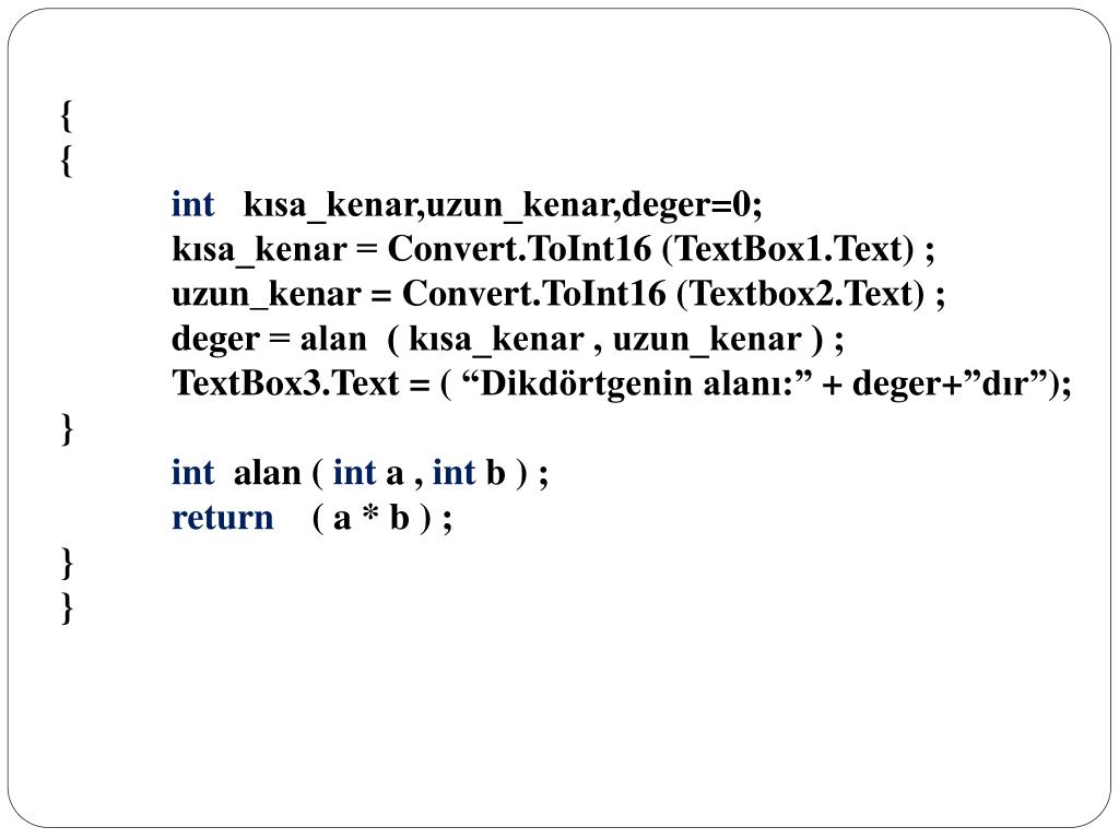 { { int kısa_kenar,uzun_kenar,deger=0; kısa_kenar = Convert.ToInt16 (TextBox1.Text) ; uzun_kenar = Convert.ToInt16 (Textbox2.Text) ; deger = alan ( kısa_kenar , uzun_kenar ) ; TextBox3.Text = ( “Dikdörtgenin alanı:” + deger+”dır”); } int alan ( int a , int b ) ; return ( a * b ) ; } }