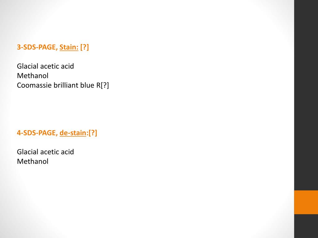 3-SDS-PAGE, Stain: [?] Glacial acetic acid Methanol Coomassie brilliant blue R[?] 4-SDS-PAGE, de-stain:[?] Glacial acetic acid Methanol