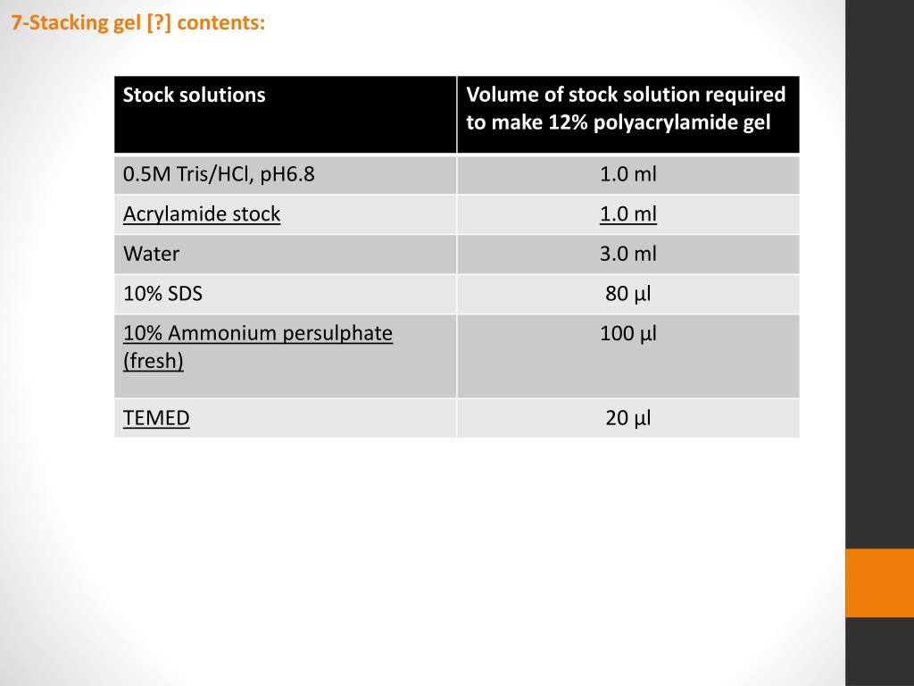 5-Sample preparation: 40µl of protein sample + 10 µl of disruption buffer boil the mixture 3minets at 99C̊ . 6-Separation gel [?]contents: