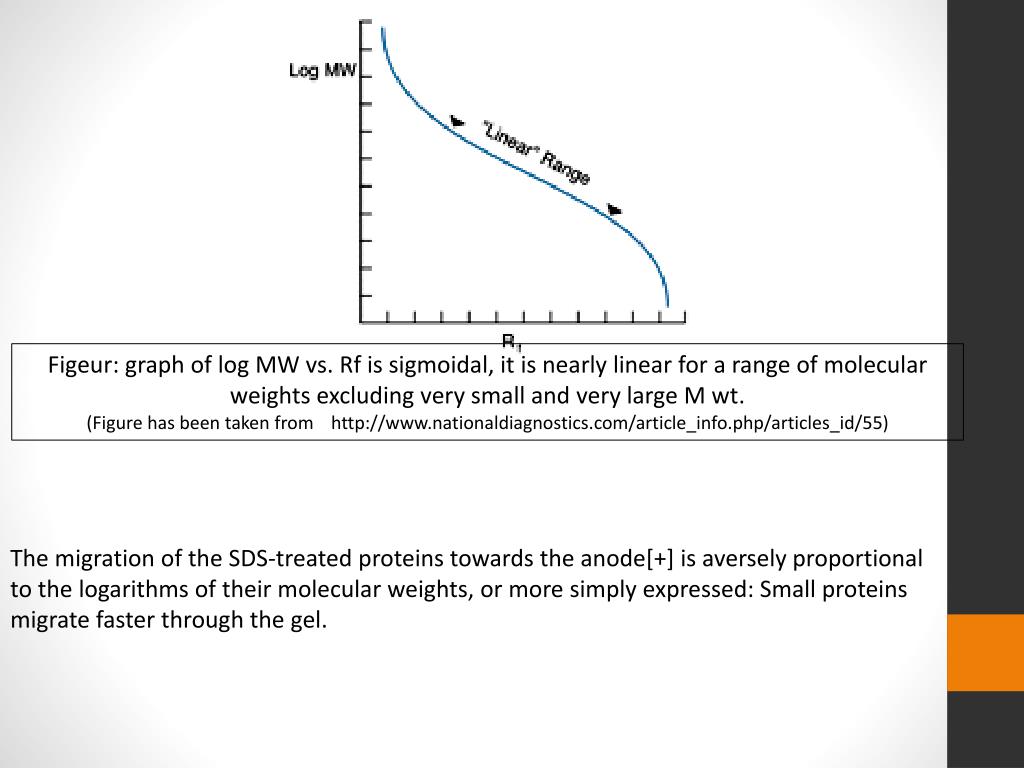 Figeur: graph of log MW vs. Rf is sigmoidal, it is nearly linear for a range of molecular weights excluding very small and very large M wt. (Figure has been taken from http://www.nationaldiagnostics.com/article_info.php/articles_id/55) The migration of the SDS-treated proteins towards the anode[+] is aversely proportional to the logarithms of their molecular weights, or more simply expressed: Small proteins migrate faster through the gel.