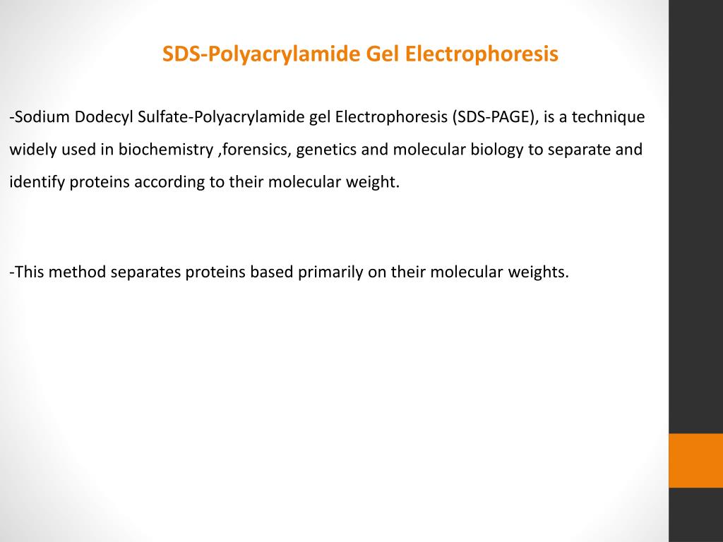 SDS-Polyacrylamide Gel Electrophoresis -Sodium Dodecyl Sulfate-Polyacrylamide gel Electrophoresis (SDS-PAGE), is a technique widely used in biochemistry ,forensics, genetics and molecular biology to separate and identify proteins according to their molecular weight. -This method separates proteins based primarily on their molecular weights.