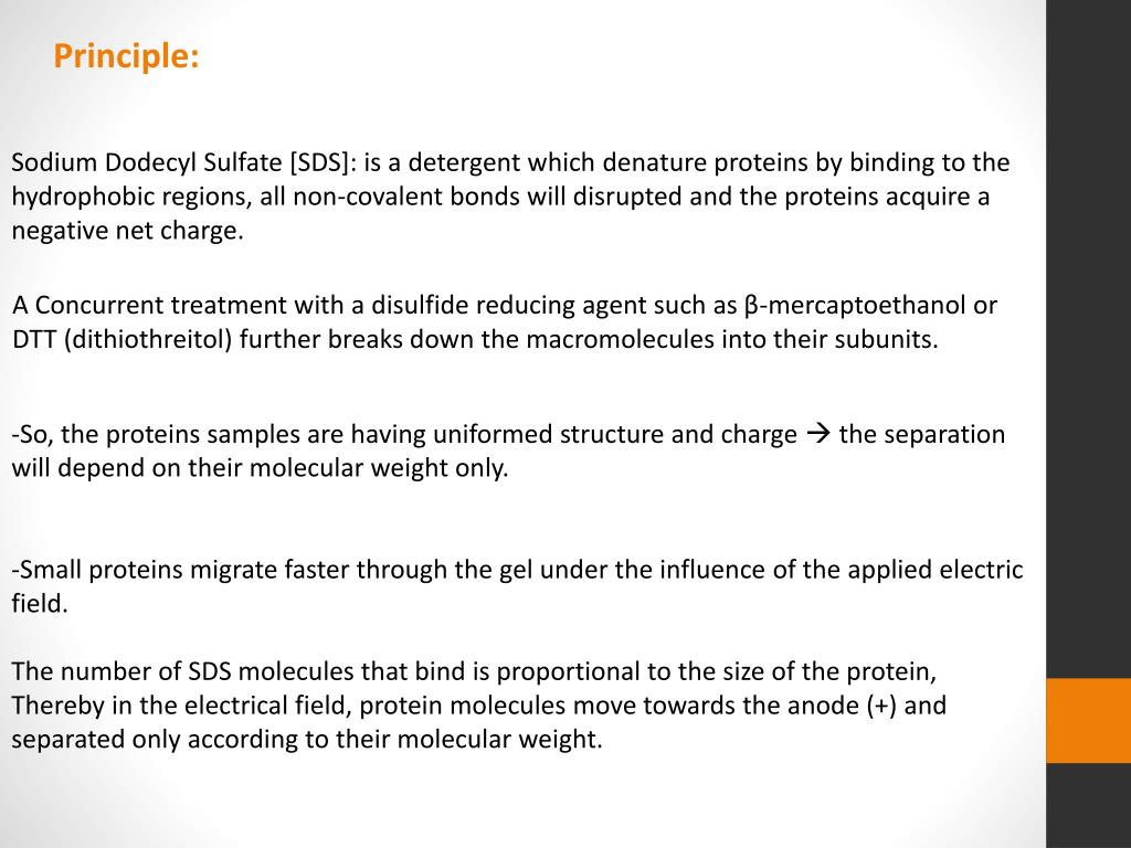 Principle: Sodium Dodecyl Sulfate [SDS]: is a detergent which denature proteins by binding to the hydrophobic regions, all non-covalent bonds will disrupted and the proteins acquire a negative net charge. -So, the proteins samples are having uniformed structure and charge the separation will depend on their molecular weight only. -Small proteins migrate faster through the gel under the influence of the applied electric field. The number of SDS molecules that bind is proportional to the size of the protein, Thereby in the electrical field, protein molecules move towards the anode (+) and separated only according to their molecular weight. A Concurrent treatment with a disulfide reducing agent such as β-mercaptoethanol or DTT (dithiothreitol) further breaks down the macromolecules into their subunits.