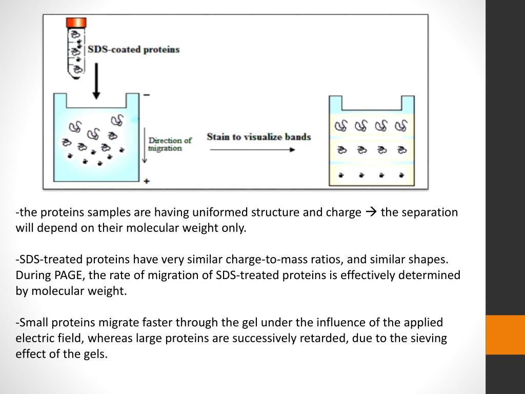 -the proteins samples are having uniformed structure and charge the separation will depend on their molecular weight only. -SDS-treated proteins have very similar charge-to-mass ratios, and similar shapes. During PAGE, the rate of migration of SDS-treated proteins is effectively determined by molecular weight. -Small proteins migrate faster through the gel under the influence of the applied electric field, whereas large proteins are successively retarded, due to the sieving effect of the gels.