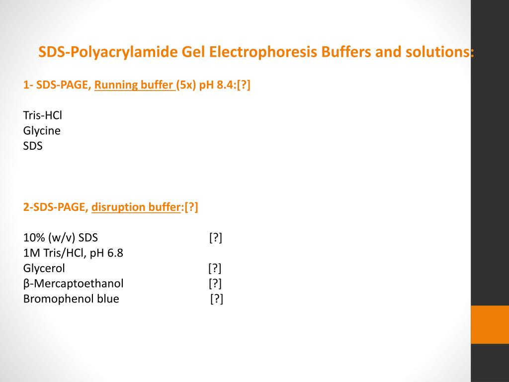 SDS-Polyacrylamide Gel Electrophoresis Buffers and solutions: 1- SDS-PAGE, Running buffer (5x) pH 8.4:[?] Tris-HCl Glycine SDS 2-SDS-PAGE, disruption buffer:[?] 10% (w/v) SDS [?] 1M Tris/HCl, pH 6.8 Glycerol [?] β-Mercaptoethanol [?] Bromophenol blue [?]